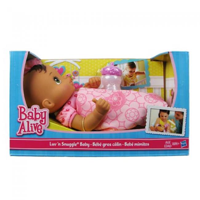 Little girls can have the love and fun of real babies with this Baby Alive Luv n Snuggle Baby Doll Brunette! She is a soft and cuddly little doll who needs your daughter to take care of her and cuddle her. She comes with a blanket for sleepytime, and a fun accessory for when she needs comfort and care. Her thumb goes in her mouth, just like a real baby! You ll love watching your little girl learn about being a mommy with the Luv n Snuggle Baby doll! Measures approximately 11-inches long. Ages 1.5 and up.