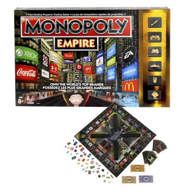 Ready to build your empire? Own the world s top brands in the Monopoly Empire Game. Choose one of the uniquely branded tokens, move around the board, and start building your empire. Buy your favorite brands one by one and slide their billboards onto your Empire Tower - this game is a race to the top! Collect rent from your rivals based on your tower height. To win, be the first player to fill your tower with billboards! 2-4 players. Ages 8 and up.