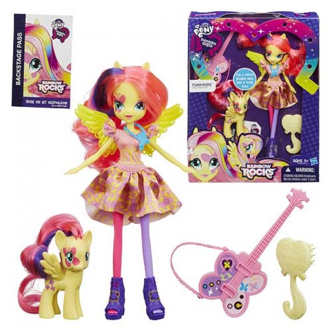 The My Little Pony Equestria Girls Rainbow Rocks Fluttershy with Pony is ready to rock! Dressed to kill and armed with a fine guitar, this musical mare is ready to go on tour with her very own Rainbow Rocks backstage pass! Measures approximately 10-inches tall. Ages 5 and up.
