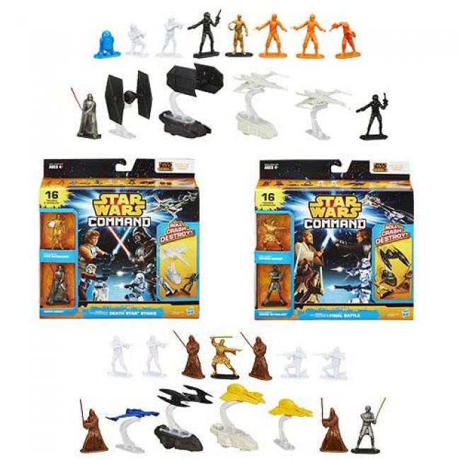 The Star Wars Command Invasion Packs Battle Figures are army men for a new generation! Droids, smugglers, bounty hunters, Jedi, Sith, and more appear in each 16-piece set. These exquisitely sculpted figures include two unique commanders in each pack, letting you grow and lead your armies to ridiculous scales! What s mroe, each vehicle has a cool pull-back sled that lets you roll, crash, and destroy the opposition. Ages 4 and up!