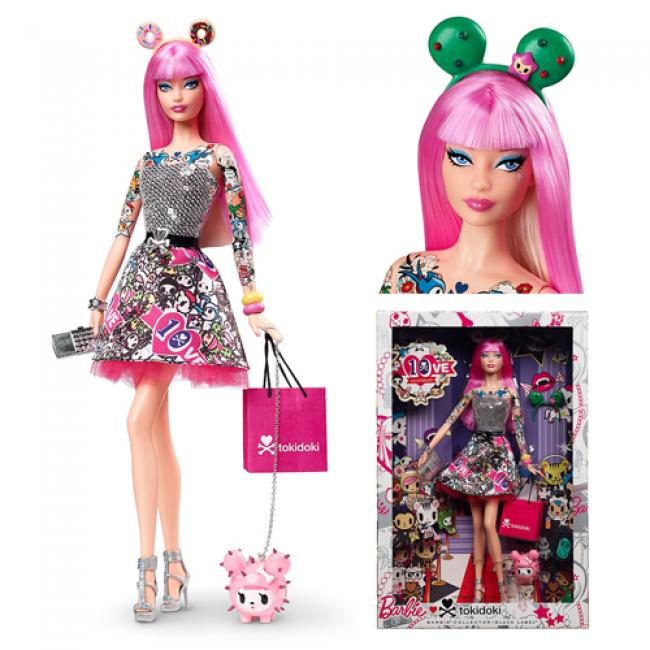 Always at the forefront of cutting-edge fashion, Barbie collaborates with whimsical lifestyle brand, Tokidoki, in celebration of the brand s 10th anniversary. Barbie is ready to shop all day and party all night in a shimmering silvery sequin top, iconic Tokidoki print skirt with bright tulle under-layer, stylish heels, and bold, colorful jewelry. Her sleek blonde hair is dyed bright pink at the tips and held in a fun headband. Other accessories include a shopping bag and her very own pink cactus dog on a leash.