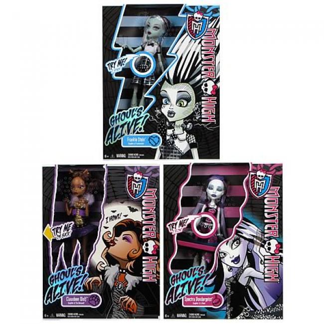 For the first time ever, the ghouls of Monster High are brought to life! Featuring lights and sounds, Monster High Ghouls Alive Dolls showcase the characters signature freaky flaws. Each doll wears a modified, over-the-top version of her original outfit and comes with a doll stand. Ages 6 and up.