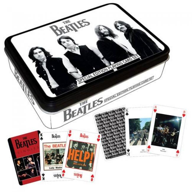 A great gift for the Beatles fan! This quality hinged tin houses 2 different packs of 52 image playing cards featuring the Beatles. Tin measures 5 1/2-inches wide x 4-inches long x 1 3/4-inches tall. Play cards with the Beatles!