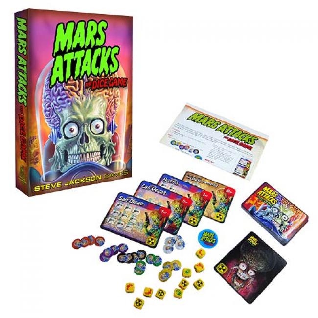 Destroy the humans! Take their cities! Conquer Earth! Mars Attacks - The Dice Game is a fast-playing tactical dice game based on the Mars Attacks trading cards by Topps. Lead your team of Martian invaders to conquer Earth. Destroy cities, get your picture taken in front of famous monuments, and be the Martian with the most Earthling kills. But watch out, because those Earthlings might nuke you! Game includes 10 dice, 24 player tokens, 30 cards, a first-player marker, and a rule sheet. Ages 10 and up.