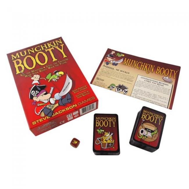 Sail the Seven Seas. Plunder the treasure. Make your buddy walk the plank! This Munchkin Booty Game brings the greatest gold-grabbers in history - pirates - to the world of Munchkin. Use your Silver Long Johns to beat the Lobster Mobster, drink your Demon Rum to fight off the Viking Kittens, and defend yourself with the Cutlass (or Cutlad, for the gents) against the Prince of Whales. But watch out for sharks! Includes 168 cards, a unique six-sided die, and a rule sheet. Ages 10 and up!