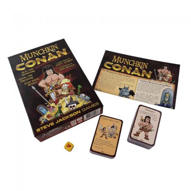 Conan - challenging the world, slaying monsters, defeating armies, laughing in the face of death. He steals the treasure, spends it, and steals more. Conan is The Barbarian!Robert E. Howard s epic hero gets the full Munchkin treatment in this Munchkin Conan Game. Play a Cimmerian Warrior or a Stygian Wizard. Wield the Sword of the Phoenix and poison your foes with Black Lotus. Slay Thoth-Amon s minions, Pict raiders, and abominable monsters, and hear the lamentations of their women! Includes 168 cards, a unique six-sided die, and a rule sheet. Ages 10 and up!