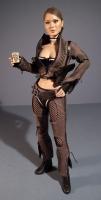 To hold the trousers up she wears a wide pleather double buckled belt that is attached to a black pleather harness for her pistol and spare magazine holsters. Her upper half is clad in a short bolero style military jacket, tailored and fabricated in the same fashion to compliment the trousers as a suit.