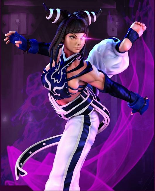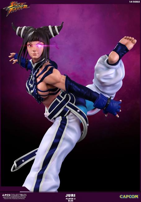 Dressed in her Player 2 colors, PCS Collectibles has recreated Juri s sultry form down to the last detail, from the ribbons that fasten her hair into horns and studs on her belt, to the spiked bracelets on her wrists and wraps protecting her mani/pedi.
