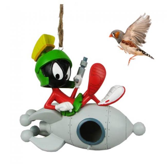 A decorative birdhouse, this Looney Tunes Marvin the Martian Rocket Birdhouse will look great in your backyard! A high quality indoor and outdoor birdhouse, this collectible is made from resin. The Looney Tunes Marvin the Martian Rocket Birdhouse measures 10 1/2-inches long and features the diabolical Looney Tunes character with laser in hand lying atop a rocket that serves as the birdhouse itself. Birds not included.