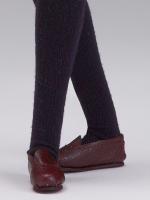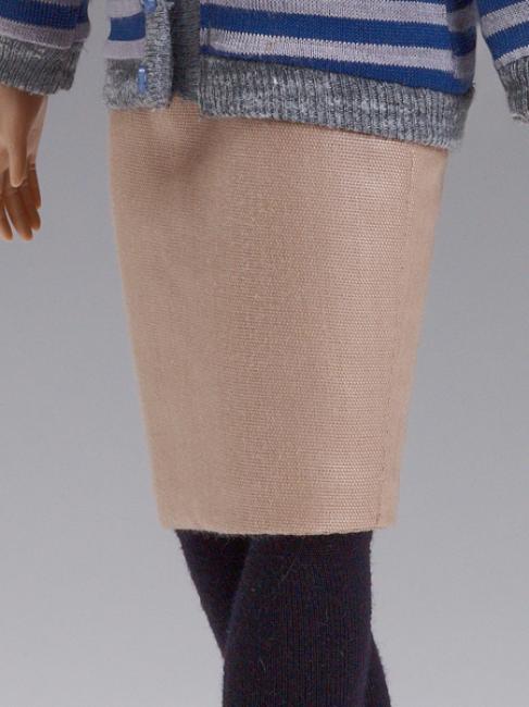Includes a gray and blue stripe cardigan, tan cotton skirt, brown glasses, display stand, and more!
