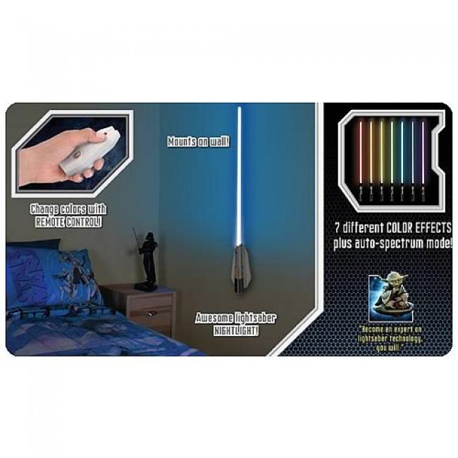 With this Star Wars Remote Control Lightsaber Room Light, you can choose from 8 different color effects, display the lightsaber on the wall, and discover real-life technology with the fun and informative learning guide. Some assembly required. Lightsaber itself is plastic while wall mounting parts are metal. It requires 5x "AAA" batteries (not included) and measures over 25-inches long. Also requires 1 wall mounting bracket and a set of mounting hardware screws to attach to a wall, both included. Display your own Lightsaber Room Light today!