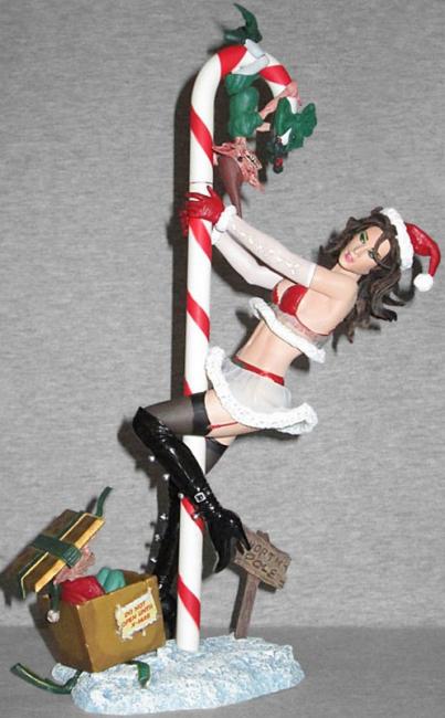 Mrs. C. s skirt and the mini-babydoll fringe on her bra [Santa baby, hurry down the chimney for me] are separate pieces, the latter glued in place, the former free-floating on her hips so it can be positioned exactly against the pole which is pushing up against its edge, and both are especially good work. They are sculpted in clear plastic, painted white on the fluffy edges, but given a thin frosted white coat elsewhere, making them semi-transparent - whether they would translate from the highly-finished prototype to the mass-market figures, but they are one of the most impressive uses of sculpt and paint we can recall.