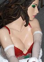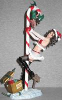 So far as quality of design and sculpt goes, this is a McFarlane figure, which is to say she is excellent - they may not know what a balljoint is, but McToys knows how to make a plastic statue Mrs. Claus is flawless from head to toe, with every detail lovingly sculpted from the indentation in her lower lip, through the lacy trim and tiny crinkles in the fabric of her lingerie, down to the sleigh bells stitched to her boots. Her figure is slim but grown up, without defined muscles but with enough of the shape of them to justify her being able to do her moves on the pole - it is a physically demanding discipline - and enough sexy curves in front and behind to have something to show off while she is doing it. Her body sculpt shows a good command of the intricacies of anatomy, how a body moves and responds to motion, especially (compared to the liberties often taken in action figures) in the area of her chest: she is leaning slightly to her left, and her right breast is appropriately swelling out of her bra cup compared to the left. It is attention to detail like that, breast-related or otherwise, that separates a good sculpt from a great one.