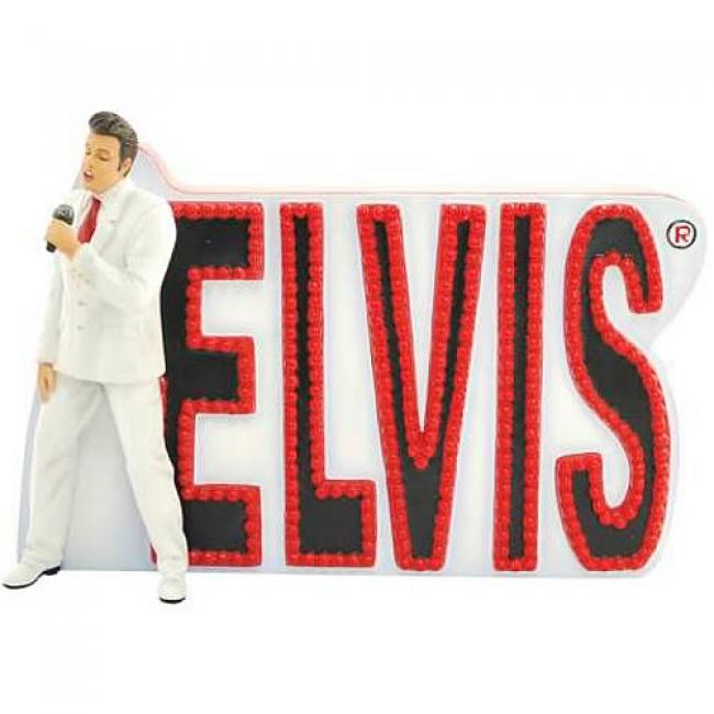 Elvis Presley Elvis in Lights Mini Statue. Bring home the King, with this Elvis Presley Elvis in Lights Mini Statue! Features Elvis in one of his signature white suits, against a black and red "ELVIS" backdrop of simulated lights. Stands 4 1/2-inches tall. Order yours today! Ages 13 and up.